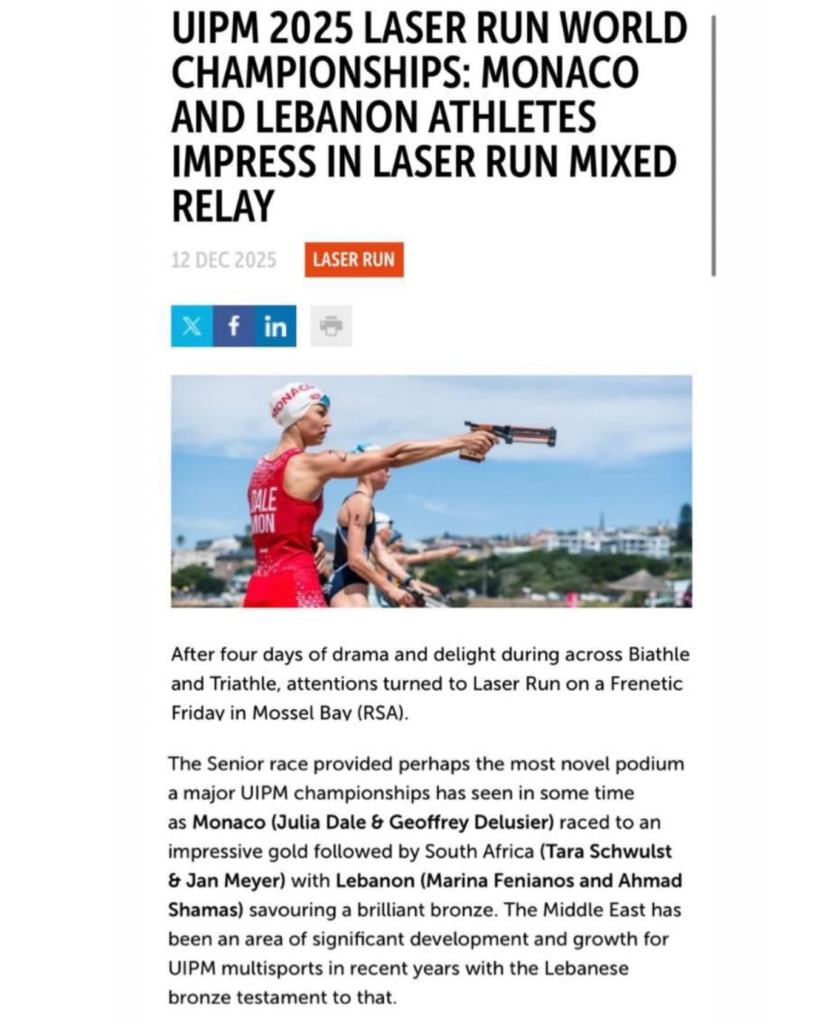 We are proud to share a major international highlight published by the International Modern Pentathlon Federation, recognizing the strong performances of Lebanese athletes at the Biathle, Triathle, and Laser Run World Championships. The article showcases Lebanon’s participation and success on the world stage, particularly in the Laser Run Mixed Relay, underlining the significant progress and development of modern pentathlon in the region.